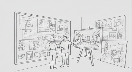 Concepts and design directions are clearly communicated through curated mood boards, detailed purchase lists, and visual presentations, supporting informed decisions on materials, furniture, finishes, and overall design coherence.