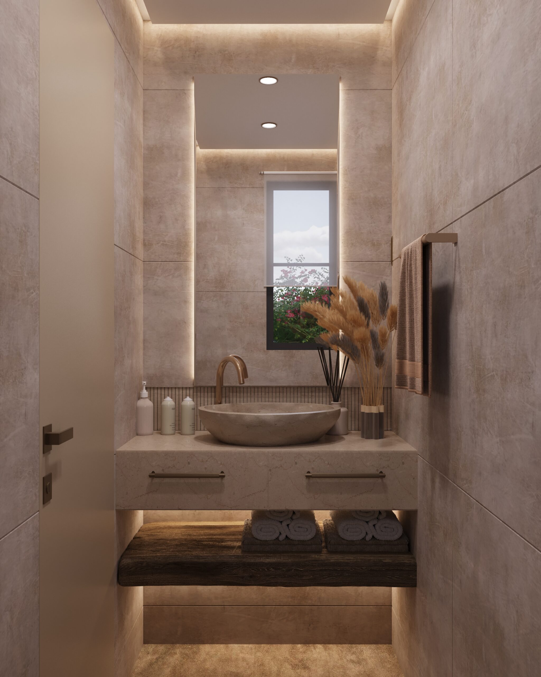 Modern and minimal powder room design developed based on real client requirements, including an easy-clean stone sink, specific vanity material selection, and a purchase list of selected fixtures for easy ordering.