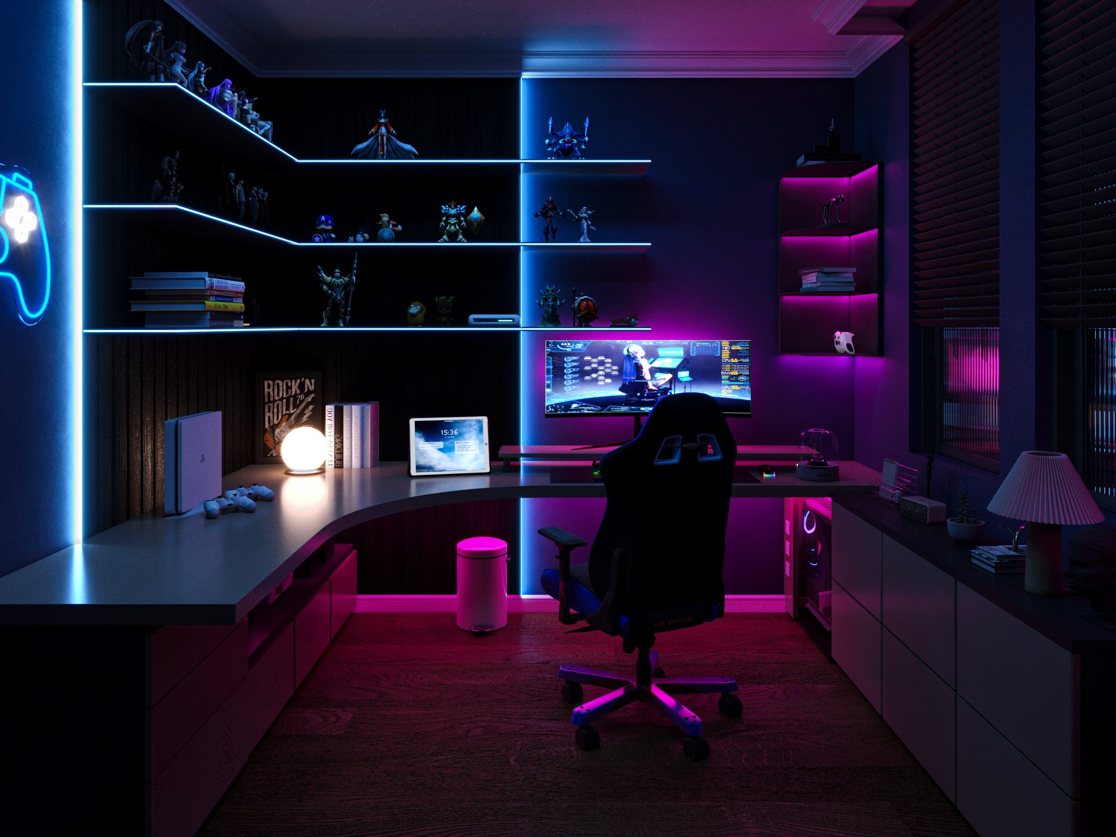 Stream and gaming room design developed based on client needs, including lighting setup, desk layout, and wardrobe storage to support an efficient and comfortable workflow.