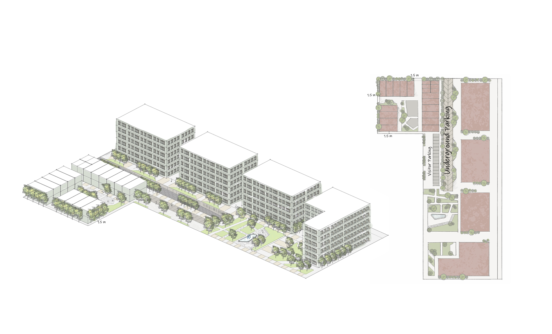 Concept landscape sketch of an urban residential area, exploring two different setback approaches in detail.