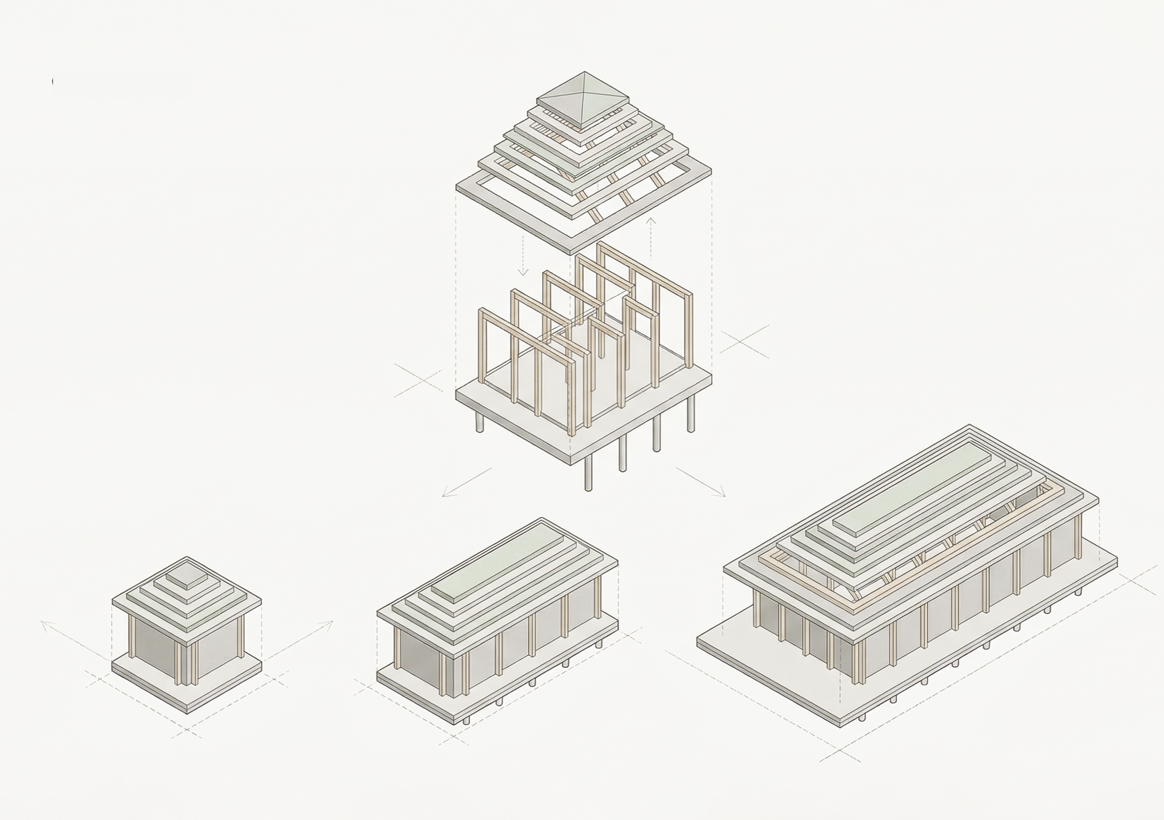 Concept development focused on geometric analysis of roof hierarchy inspired by tomb architecture, exploring multiple structural and formal alternatives to define proportion, massing, and spatial identity.