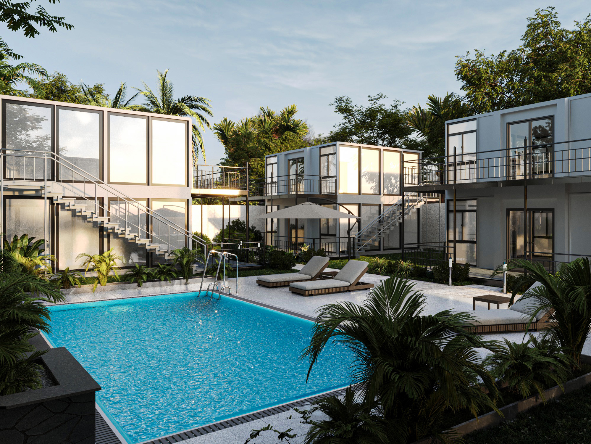 Residential area design including five prefabricated houses, parking spaces, a pool, and region-adapted vegetation. Each housing unit and site element is fully detailed to support direct contractor execution.